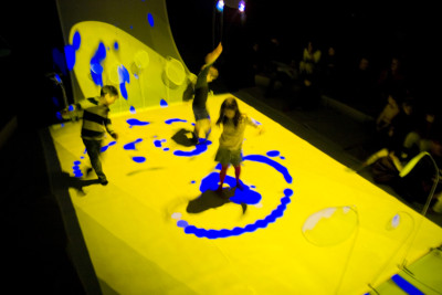 Onstage there is a butterfly house made of gauze and colorful images projected onto a white carpet and two big wings enwrapping all the space. Two dancers move, play, paint in the air; they are light and invite the audience to discover a fashinating process, the slow metamorphosis which transforms a chrysalis into a butterfly.