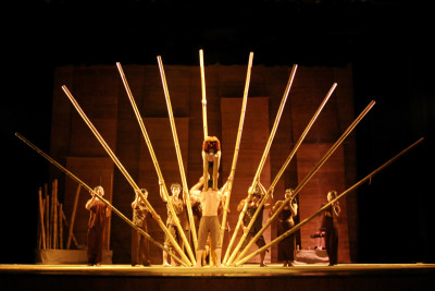 The artists of Lang Toi compose the everyday rhythm of Vietnamese village life with four and and half meter-long bamboo sticks. Apart from the entertainment value of the new circus genre, we can learn a lot about the cultural experiment of artists in peasant garb trying to show and act ploughing with hands, irrigation, the market, building houses of the traditional practices of celebration, accompanied by live music.
