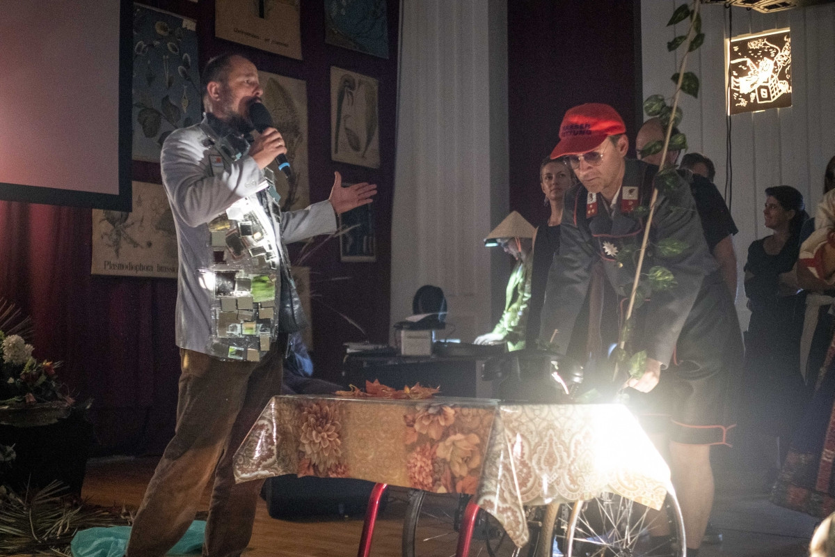 Presented for the first time after its Graz premiere in the cooperation of tranzit. hu and Trafó House of Contemporary Arts, this unique performance is the closing event of tranzit. hu’s „Regime Changes” annual program series. Together with their plant allies, the artists transform the ceremony hall of the Center of the Vasas Federation of Metalworkers' Union into the site of the eagerly awaited revolution.