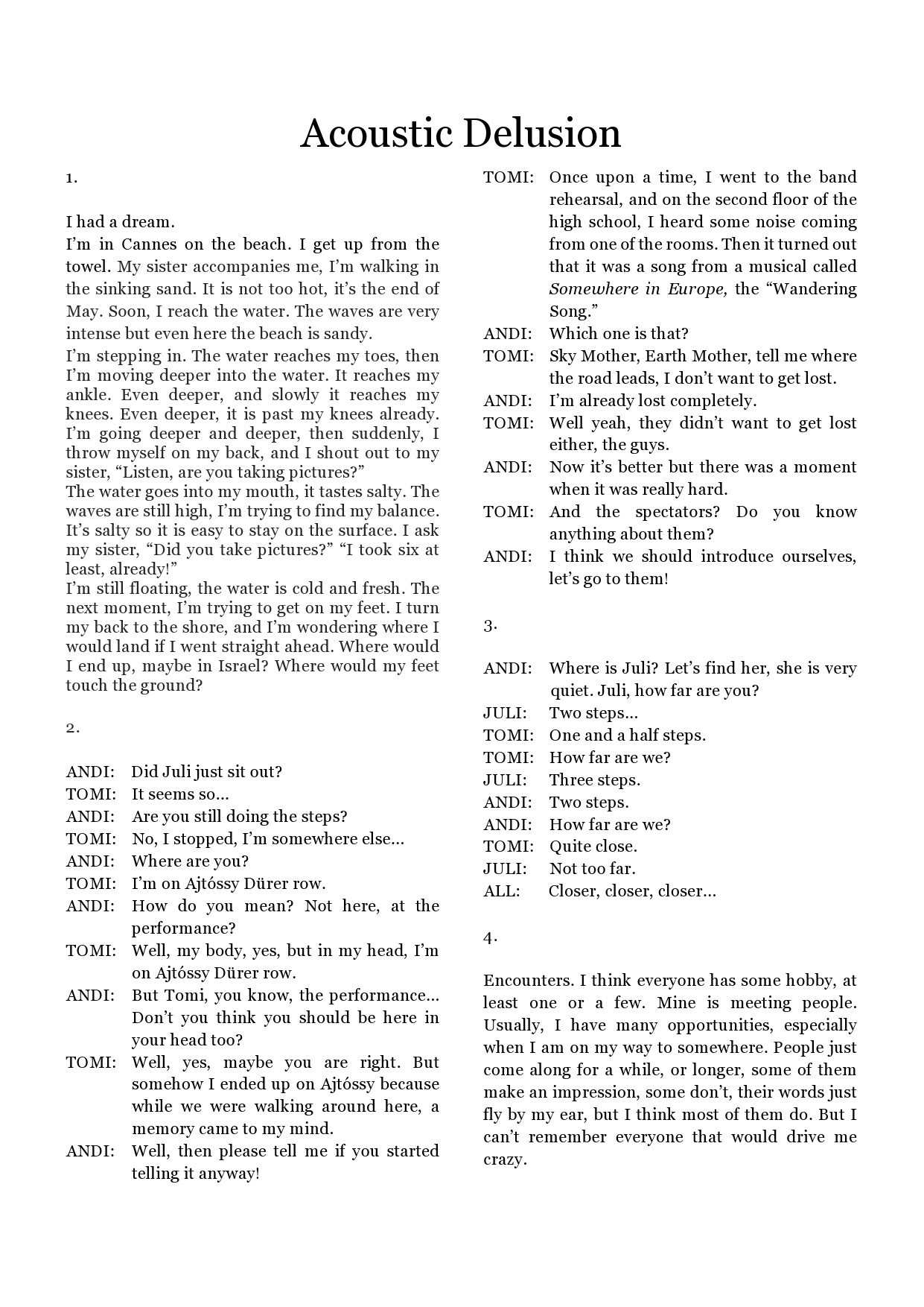 In the mixed-ability dance performance called  Acoustic delusion / illusion the creators deal with the topic of lack of visual perception and they are experimenting with other types of perceptions like hearing, touching, perceptual and kinesthetic perception. The interactive dance theatre performance based on the personal stories of Tamás Barkó. The aim of this interactive creation is to involve the audience into the special and unusual world which is free from visual stimulations.