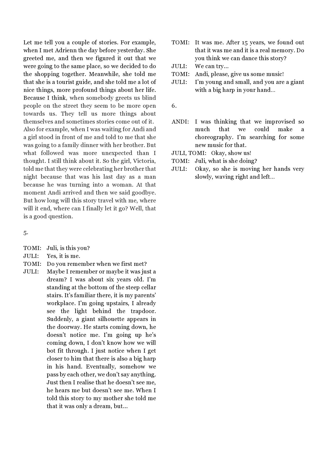 The stage is formed by the audience sitting in a circle. The dancers also take their place in the circle. In this way they are changing they roles sometimes as an observator - like the participants-sometimes as a performer. They are connecting to the audience in different ways with their actions and reactions.