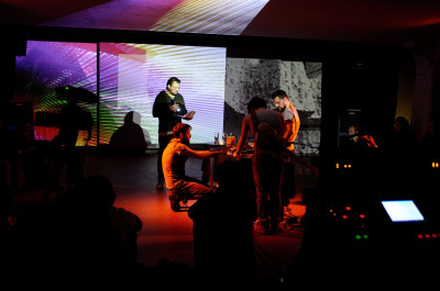 The performance of the group is using monumental motives of an almost forgotten epoch to evoke a subculture, which never existed, and to try to flash images from this subculture for the audience. The performance summons the major tendencies of Hungarian post-war modernism, with appropriating fragments of texts, reviews written in the 1970s and 1980s about public sculpture. The abstract text collage creates a uniquely toxic sound together with the futuristic, experimental and avantgarde music, which sometimes compliments, sometimes deconstructs and deteorritates the overall effect. The group’s performance adds a new imaginary perspective on the poetic examination of contemporary asbtract tendencies.