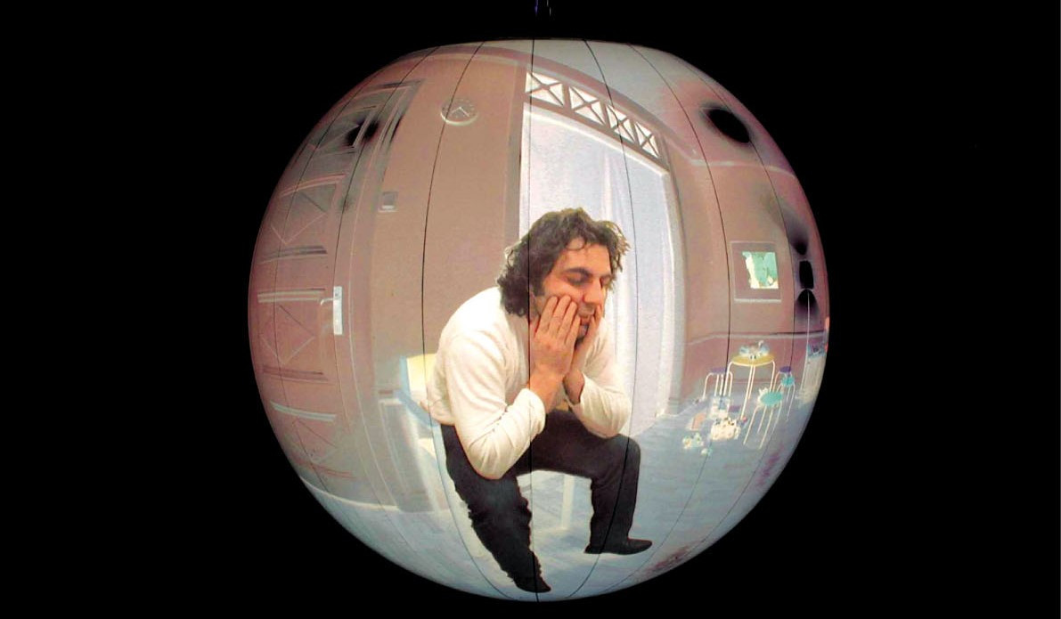 Getting out of these spaces, the visitors find themselves in an inner section of the dark gallery where spherical photographs and a smaller video projection by Bigert & Bergström is shown. The spherical photographs, depicting waiting rooms with lonely characters endlessly waiting in them, are rotating slowly, somehow echoing to dynamics of Dahlberg’s spaces. The round-shaped projection shows a figure from above, ceaselessly trying to get out of the room through one of its four doors but immediately appearing trough another one.
