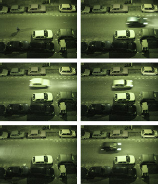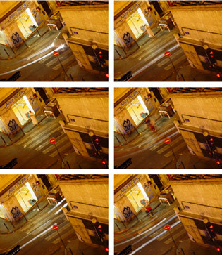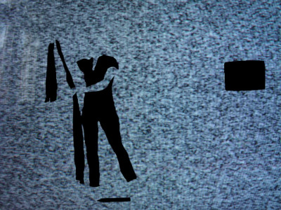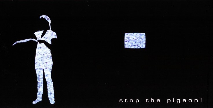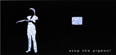 Trafó’s exhibition space plunges in darkness. There is only the vibrating light of video projections contouring the small and simple architectural construction in the middle of space to which the exhibited works, the presentation of Marcell Esterházy’s most recent animations, are reduced. From inside the cube, projected to its four walls, four animations of the series entitled Stop the pigeon! can be seen, the phase pictures of which have been taken by digital camera, manipulated by computer and then put together to a moving picture. I could mention phase pictures because the visual world of videos, the technique and the title chosen for the exhibition carry cartoon references too.