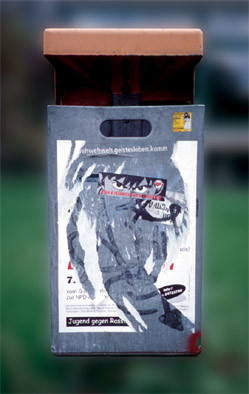 He unfolds the possibility of humour hidden in the pictures sometimes through the simplest, almost obvious interventions, such as in the installations Kresz Test Ladies (1999) or Balatoilette (2000). Kresz Test Ladies, with its play on words offering a number of interpretation (KRESZ being the name of the traffic code and “test” meaning body in Hungarian) is based on a found photo, on which the author is not interested in the graceful ladies’ legs showing from under the flapping skirts, but their shadows. The photo that aimed at arresting reality and the moment is reduced to a pictogram by the insertion a simple red triangle: mother with child in black-and-white, well known from the traffic sign warning for the presence of pedestrians. If you neglect the sign, there will be a crash, and the walking ladies will become “crash-test” (see “test” in Hungarian and in English).