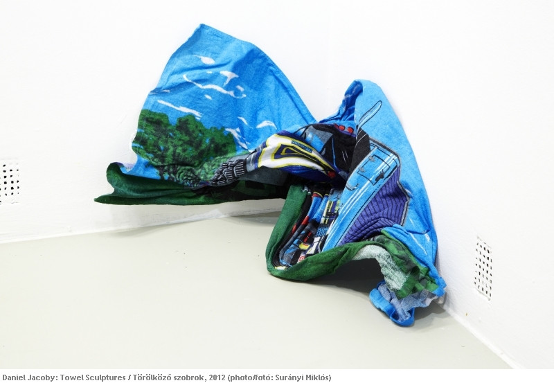 The towel sculptures of Daniel Jacoby, which make their debut at this exhibition stall and record outlines of objects, which are not present beneath, and together with the embroidered inscriptions they provide an insight on the exceptional, emblematic and enigmatic narrative methodology of the artist.