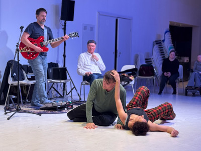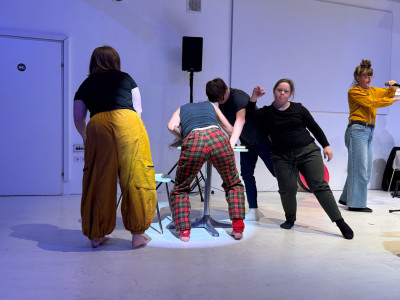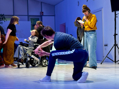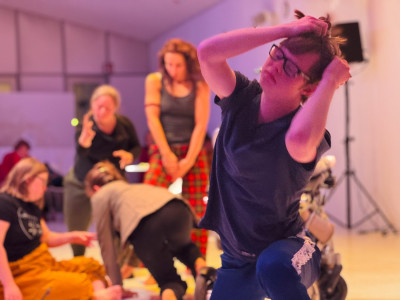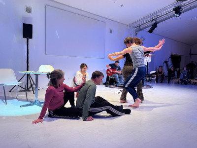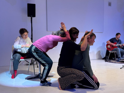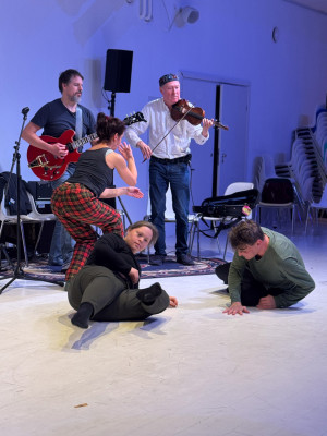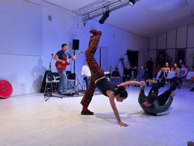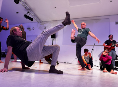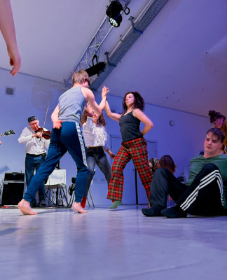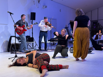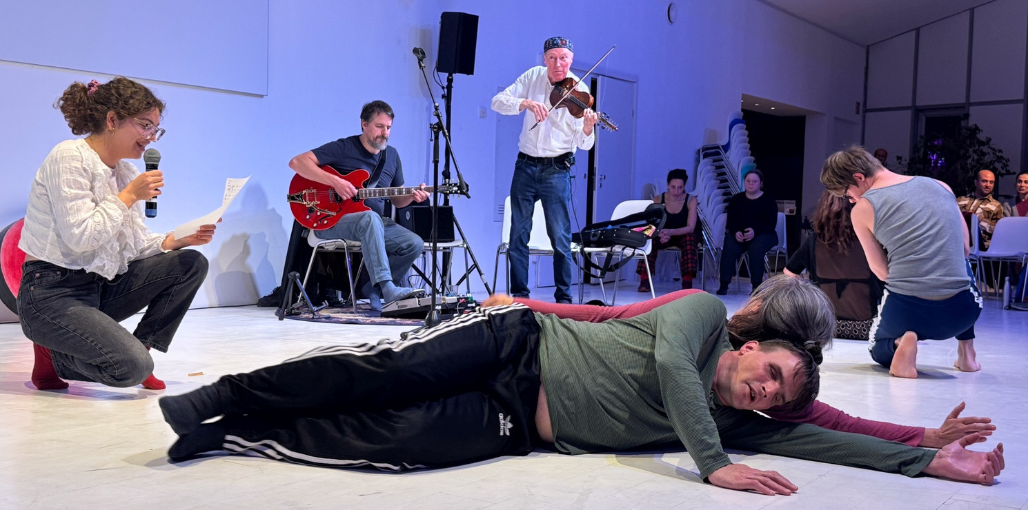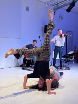Két tánccsoport improvizációja, élőzenével és a pillanatban íródó versekkel.