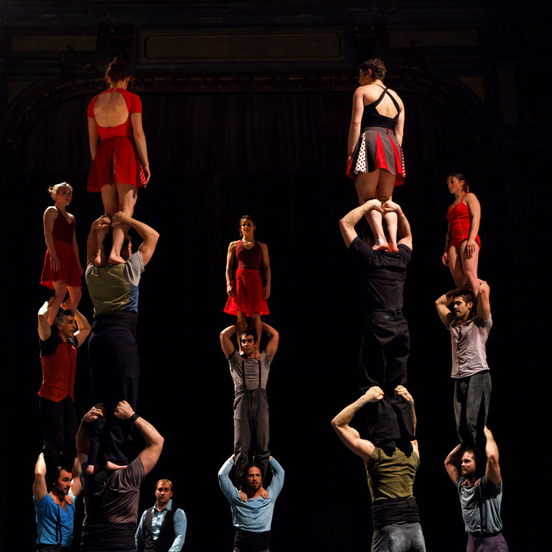 A 17 vakmerő francia akrobata – akiket felfelé húz a gravitáció – megeleveníti ezt a hangyajellegű mikro-társadalmat. Átlagos emberek válnak igazi óriásokká egy-egy pillanatra, míg meg nem inog az embertorony. Az akrobaták beleolvadnak a tömegbe, felveszik a ritmusát, belemerülnek az áramlásába, összekeverednek a mellettük elhaladókkal és ezzel az érzéssel eltelve építik fel a mutatványaikat. Feltűnő hétköznapiság, virtuóz egyensúlyozás és elképesztő erő, a biztonsági hálójuk pedig a bizalom.