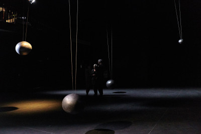 "Az ingák felfüggesztve, motorok segítségével mozognak előre meghatározott pályán, miközben mi, a nézők, saját döntésünktől vezérelten járjuk be a teret. A falra vetített kép e kettő mozdulatsor tánca: az előre programozott, így kiszámítható úton haladó golyóké, és a kedvük szerint sétáló embereké. Mindezt ölelő sötét tér és a felerősített motor búgása teszi teljessé."