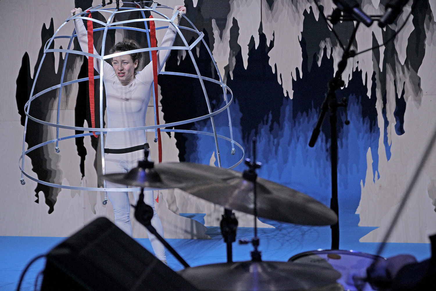 Eurüdiké ereiben szívódik fel a kígyóméreg, és közben beszél. Haldoklik a réten vagy a backstage-ben, rázkódik, és közben beszél. Meghal, árnya leválik borjúbőr kosztümbe burkolt porhüvelyéről, és közben beszél. Már az árnyak birodalmából hallgatja, ahogy popzenész férje a torkát csak érte tornáztatja, és közben azt mondja: csöndet akar.