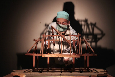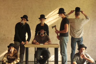 Ajtók vándorolnak, izmok zenélnek, téglák szólnak, fehér árnyak vetülnek, a szereplők egy húron pendülnek ebben a magával ragadó, sűrű, meghökkentő képekből építkező vizuális színházi alkotásban. Az előadás tere, jelen esetben a Trafó épülete, mint eleven test, az alkotói folyamat szerves részét képezte.