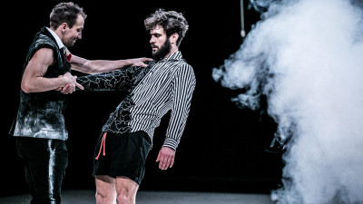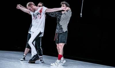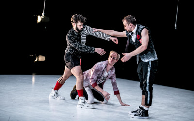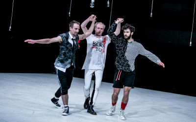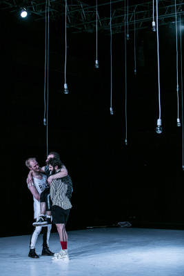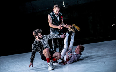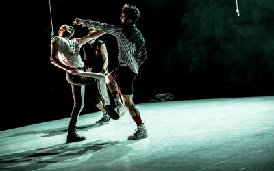 Fülöp László legújabb koreográfiájában három férfit látunk a színpadon. Alakváltó figurák. Talán haverok. Talán testvérek. Nem sok közös van bennük, de igyekeznek erről nem tudomást venni, ha már egymásra lettek utalva a semmi közepén. Próbálnak közel kerülni egymáshoz, és mindeközben kellően biztonságos távolságot tartani a másiktól. Szociális lények, de makacsul önállóak, függetlenek és bizonytalanok bizalmatlanok. Mert ha valamivel óvatosan kell bánni, az a kötődés. Vagy legalábbis veszélyes.