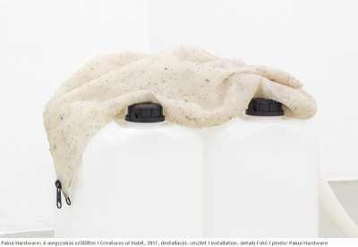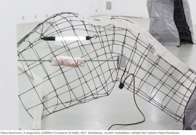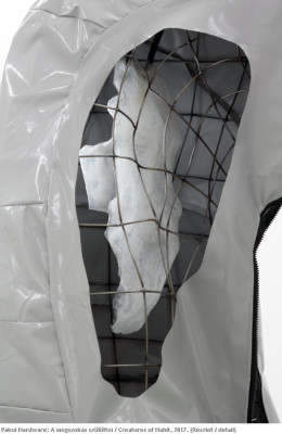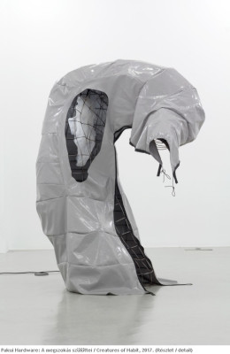 A Pakui Hardware kiállítása az automatizált társadalmakhoz kapcsolódó víziók kontextusába írja be magát. Közkeletűek ugyanis azok a fantáziák, amelyek szerint a jövőben az emberek teljes kényelmet élvezve kizárólag spirituális és kulturális tevékenységeknek szentelik majd magukat a testedzés és a kreativitás kultusza mellett. Ez az állapot azonban egyértelműen csak egy privilegizált poszt-munkás osztály számára lesz elérhető, így nem is az embereken van a fókusz. A kiállítás figyelme sokkal inkább a nem-organikus munkások-felé fordul: azon automatizált, ugyanakkor egyenruháik révén mégis organikusnak-tűnő hibridek-felé, amelyek emberi és gépi tulajdonságokat, gesztusokat ötvöznek. Mi több, egy olyan ismeretlen átmeneti faj képviselői, amelynek fém teste, vízhatlan és szilikon védőruhái alkotnak egy szintetikus egészet.