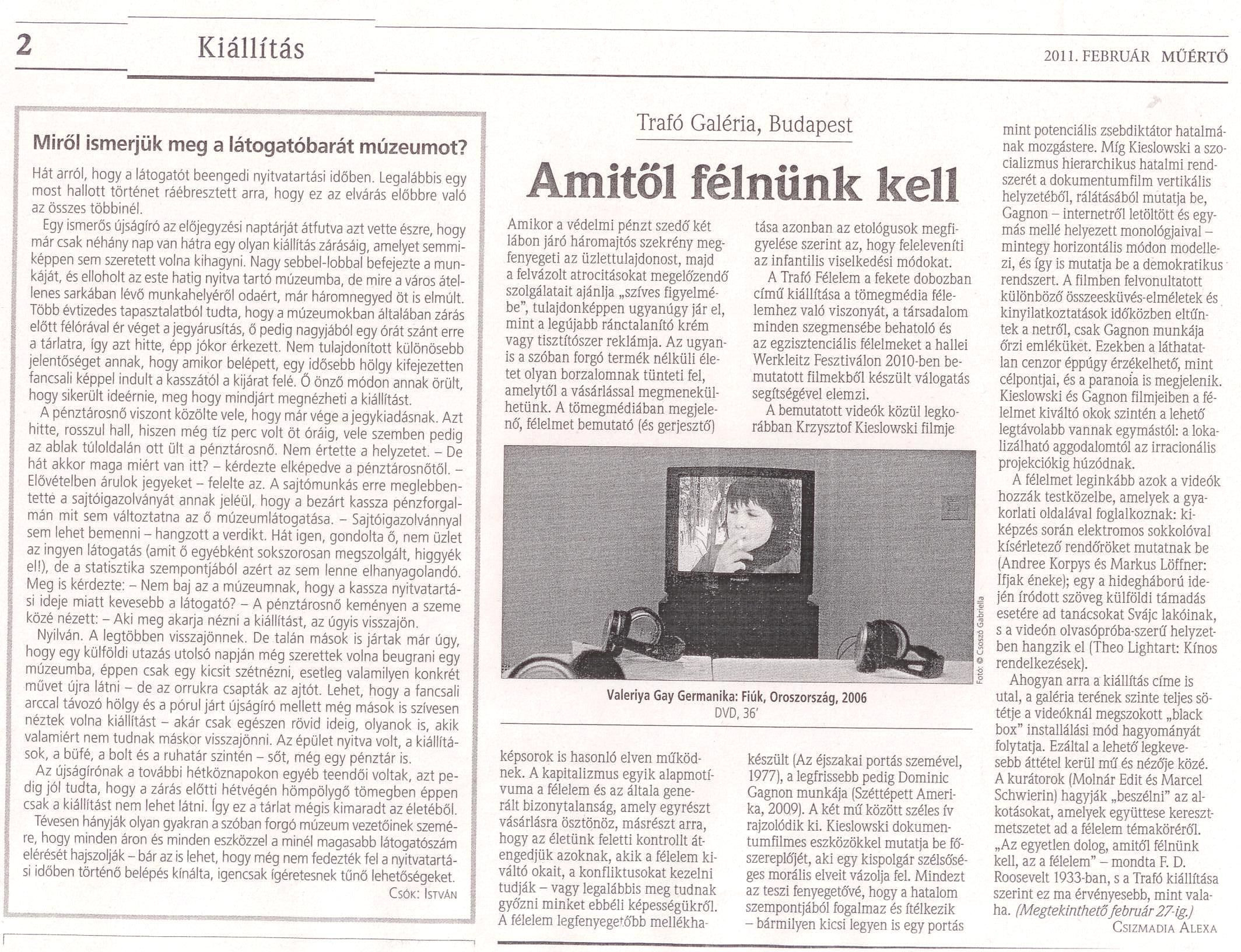A félelem jelenléte egyre erősödik a tömegmédiában. De vajon miként tudjuk megalapozott félelmeink reprezentációját megkülönböztetni azoktól, amelyeket a média gerjeszt? A kiállítás a mozgógép nyelvén keresztül vizsgálja félelmeink eredetét, hatásmechanizmusát és erősödő befolyását társadalmunkra.